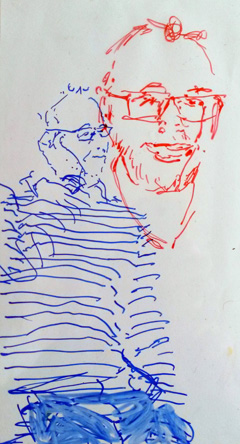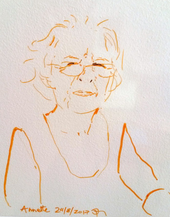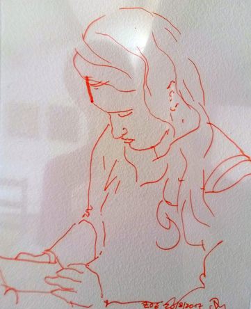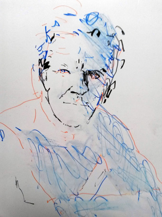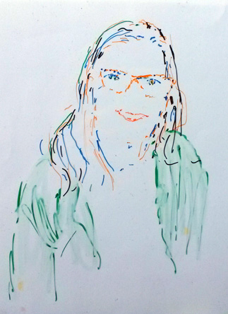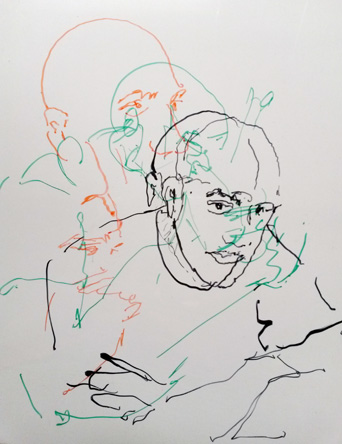 Avec des feutres permanents sur un transparent, je décalque le réel. Chaque face à face est unique et le dessin résulte des multiples paramètres de l'instant partagé. Ce dispositif optique précèda la photographie. Dürer 1515. La couche photosensible se fait impressionner sans choisir. J'interviens avec une subjectivité assumée. Performance sur demande pour évènements de tous types quand identité et représentation sont en jeu.